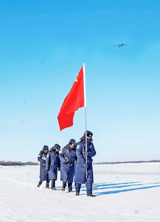 图为乌苏镇边境派出所民警在封冻的乌苏里江面上实验巡边任务。
